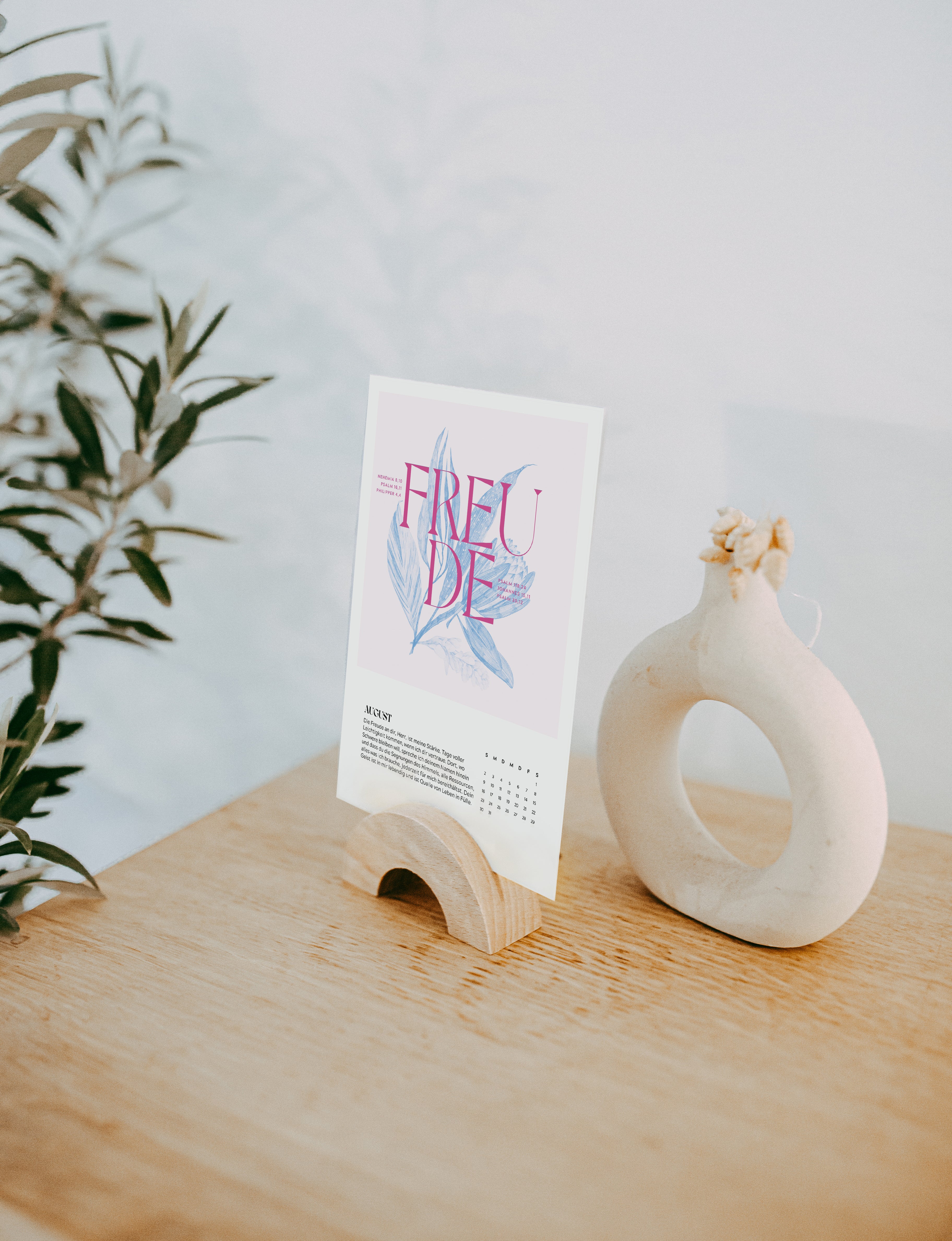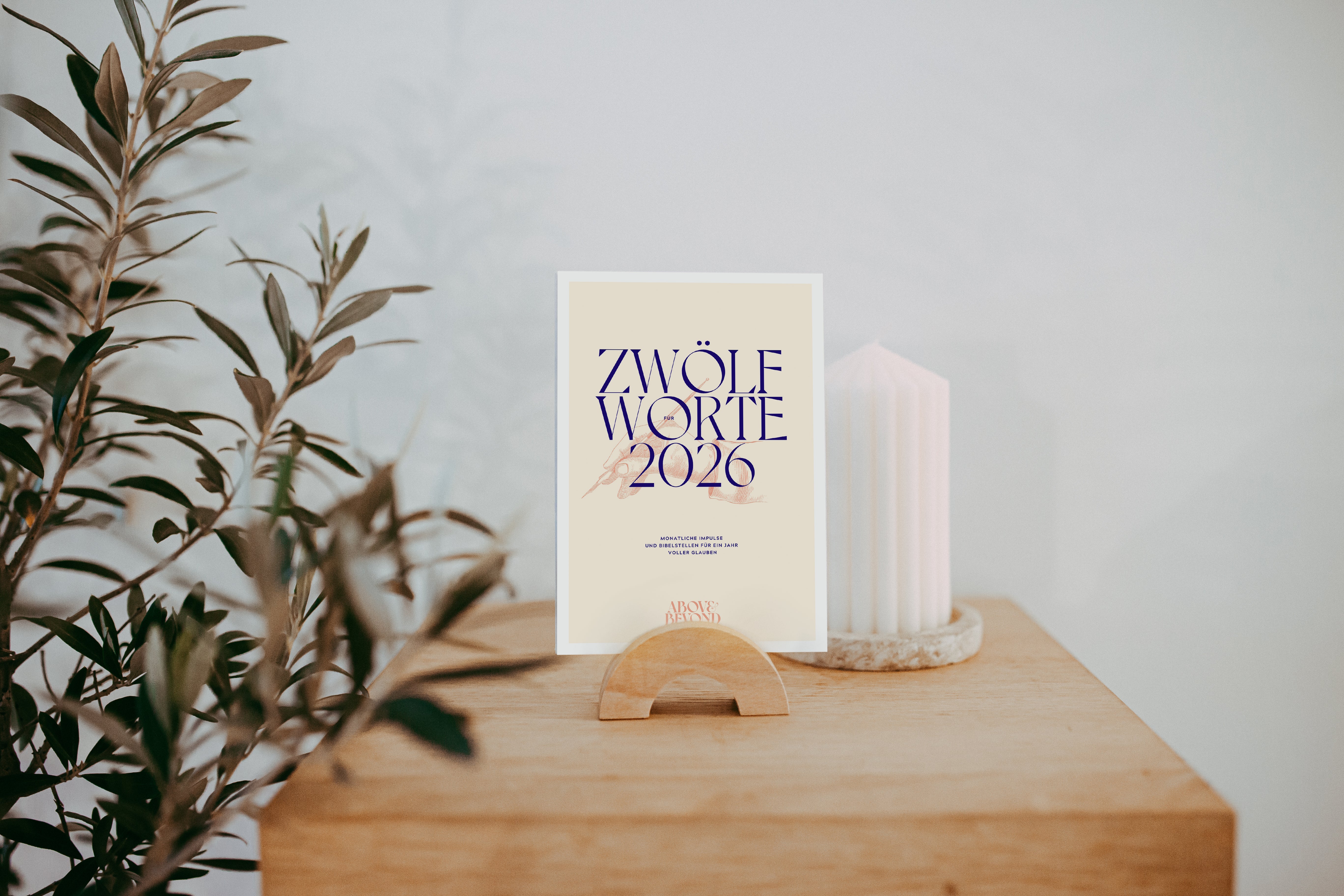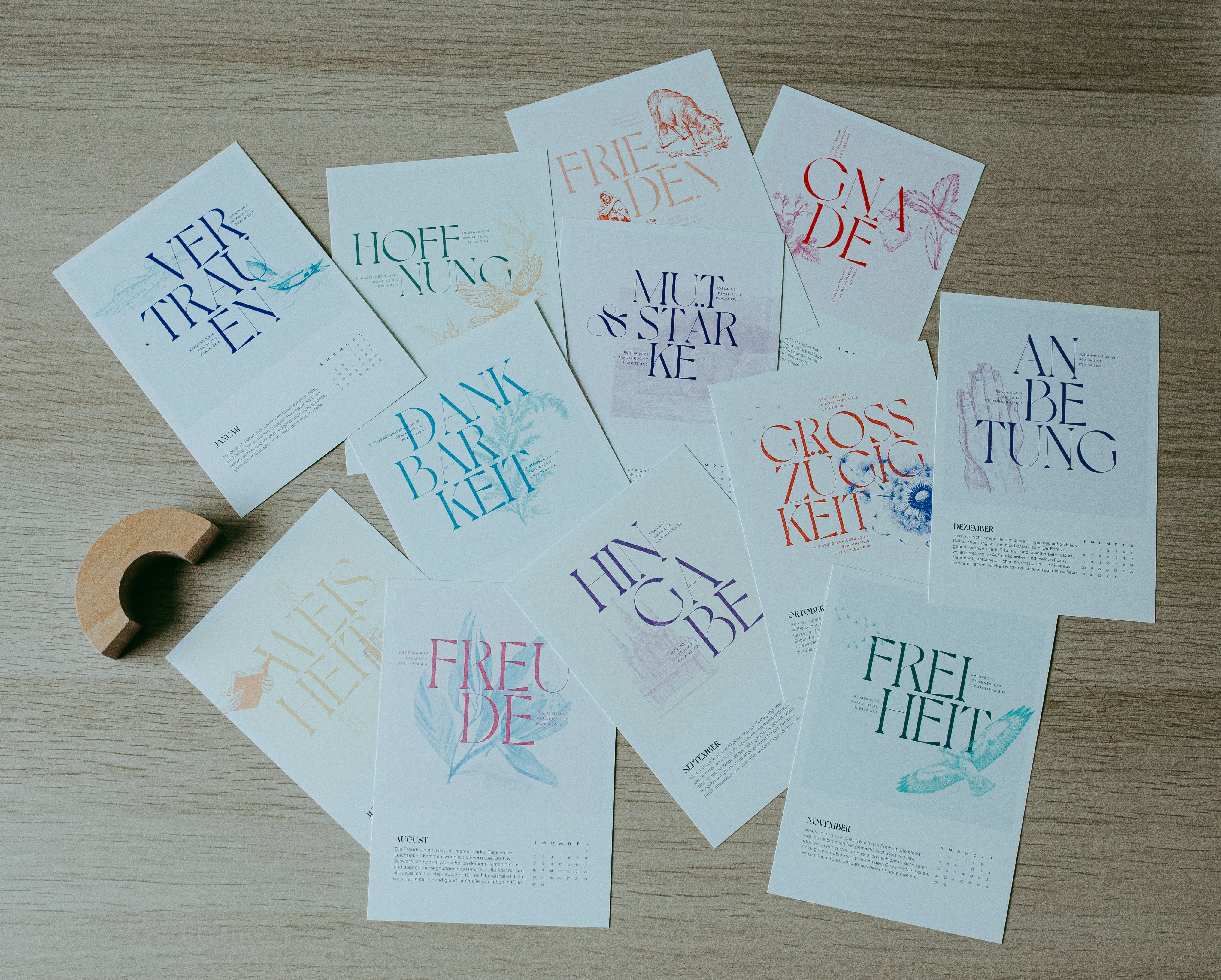 Jede Karte schmückt ein typografisch gestaltetes Wort, das durchs Jahr begleitet – zum Aufstellen, Verschenken oder Weitergeben. Jeden Monat gibt es eine Sammlung von Bibelstellen zum Thema, sowie ein kurzes, kraftvolles Gebet.